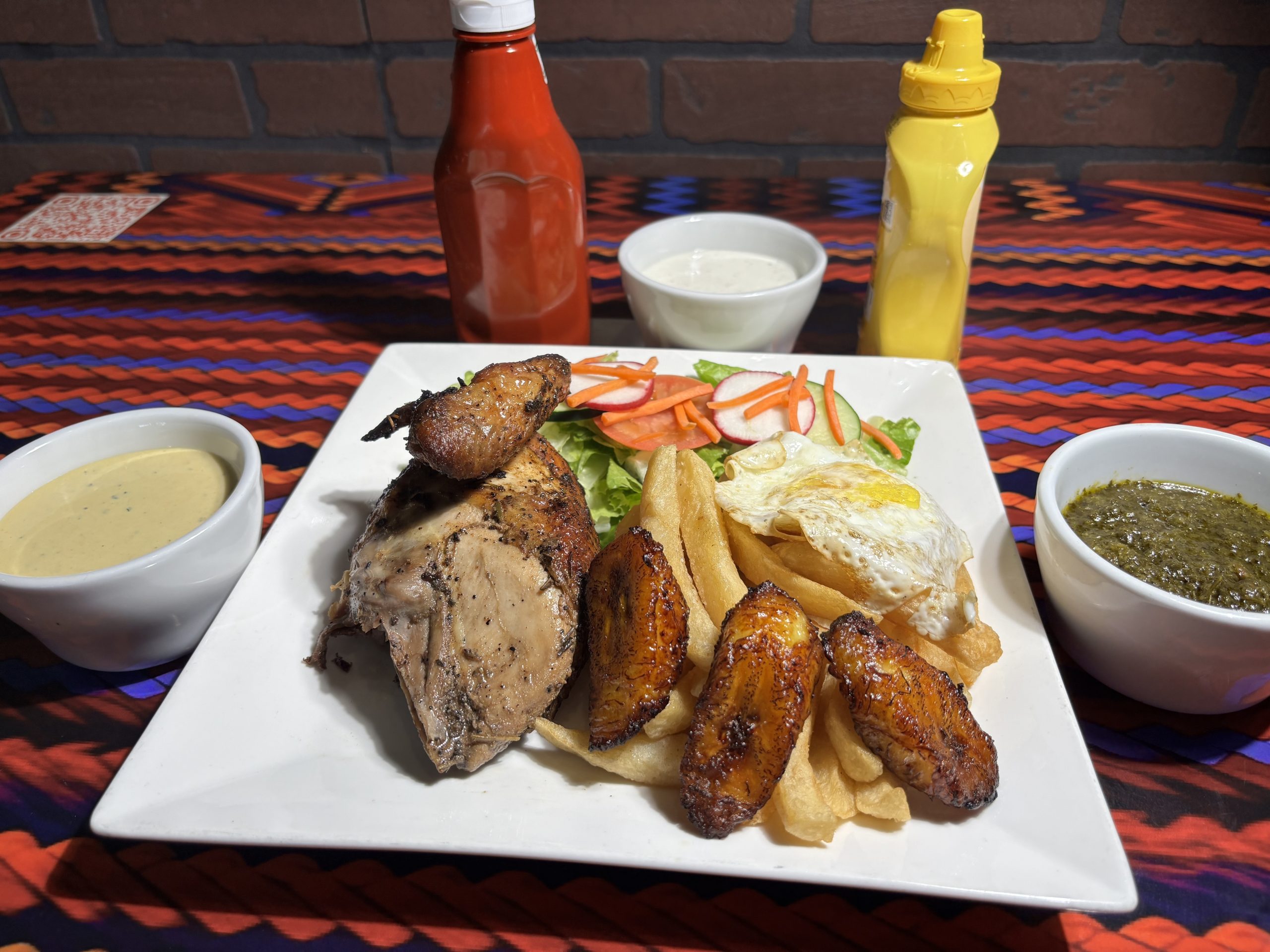Quarter chicken, french fies, house salad, fried plantains and fried egg