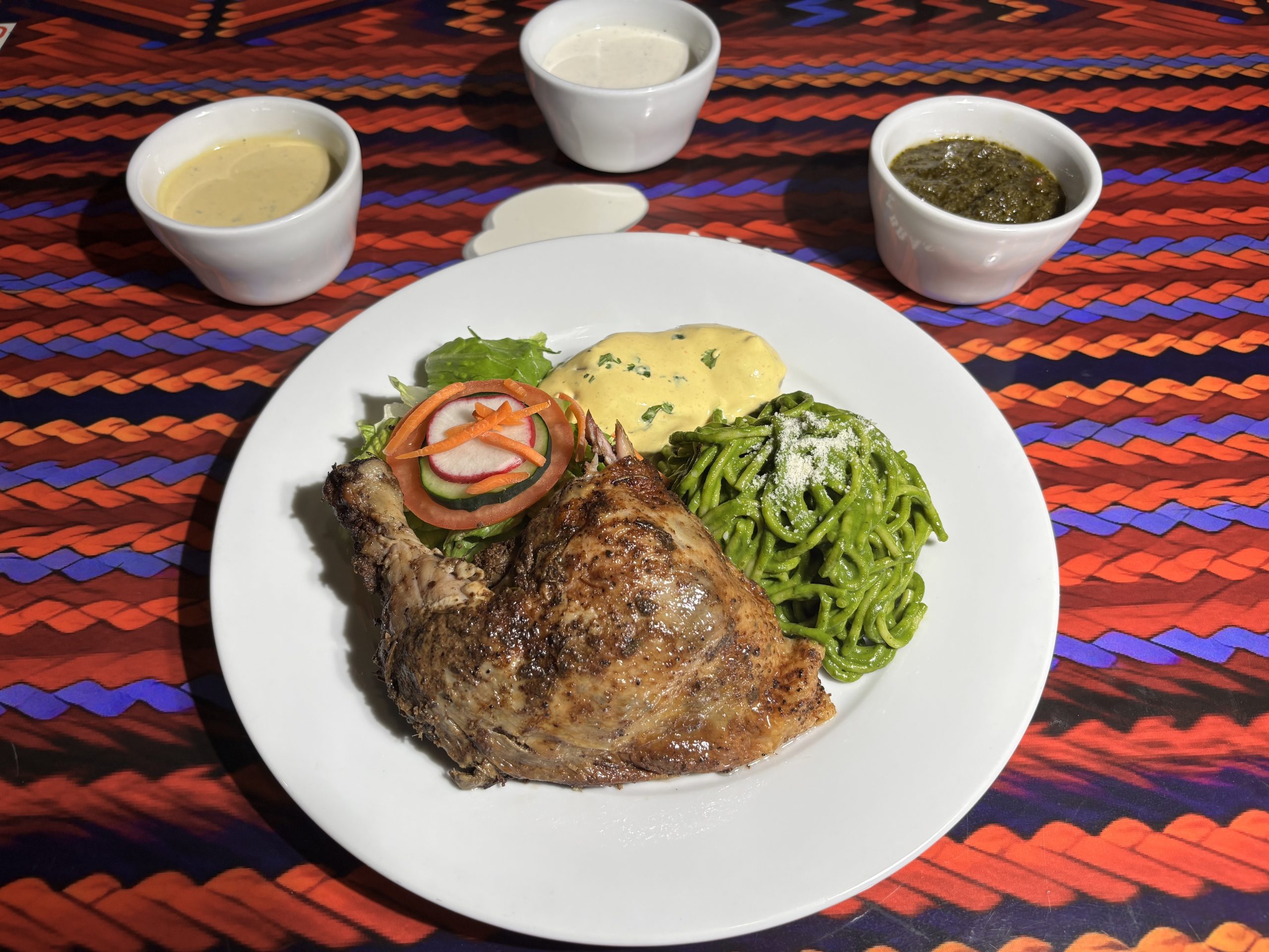 Quarter chicken, pesto pasta, huancaina sauce, house salad