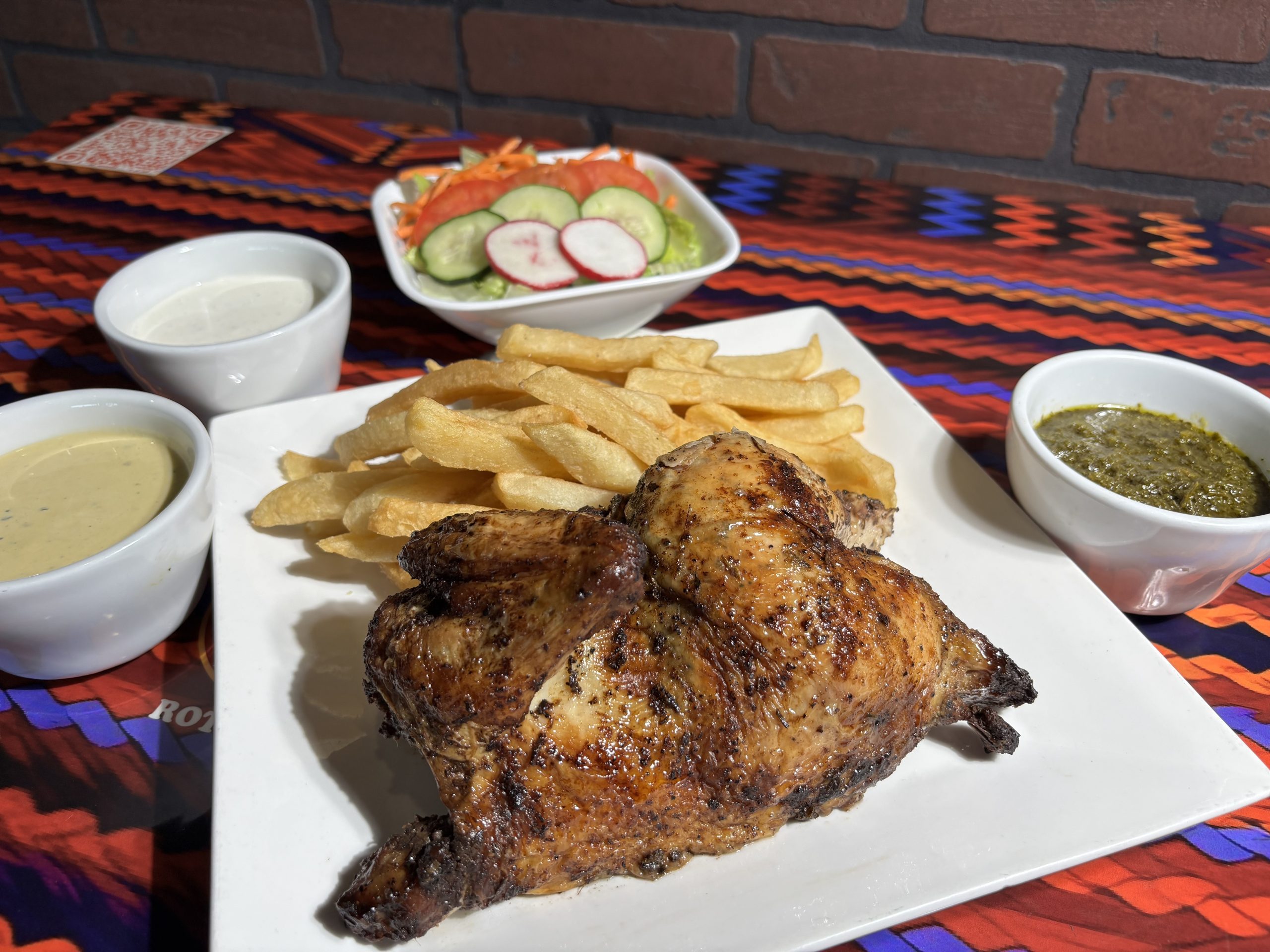 Half chicken comes with two sides of your choice and aji sauce.