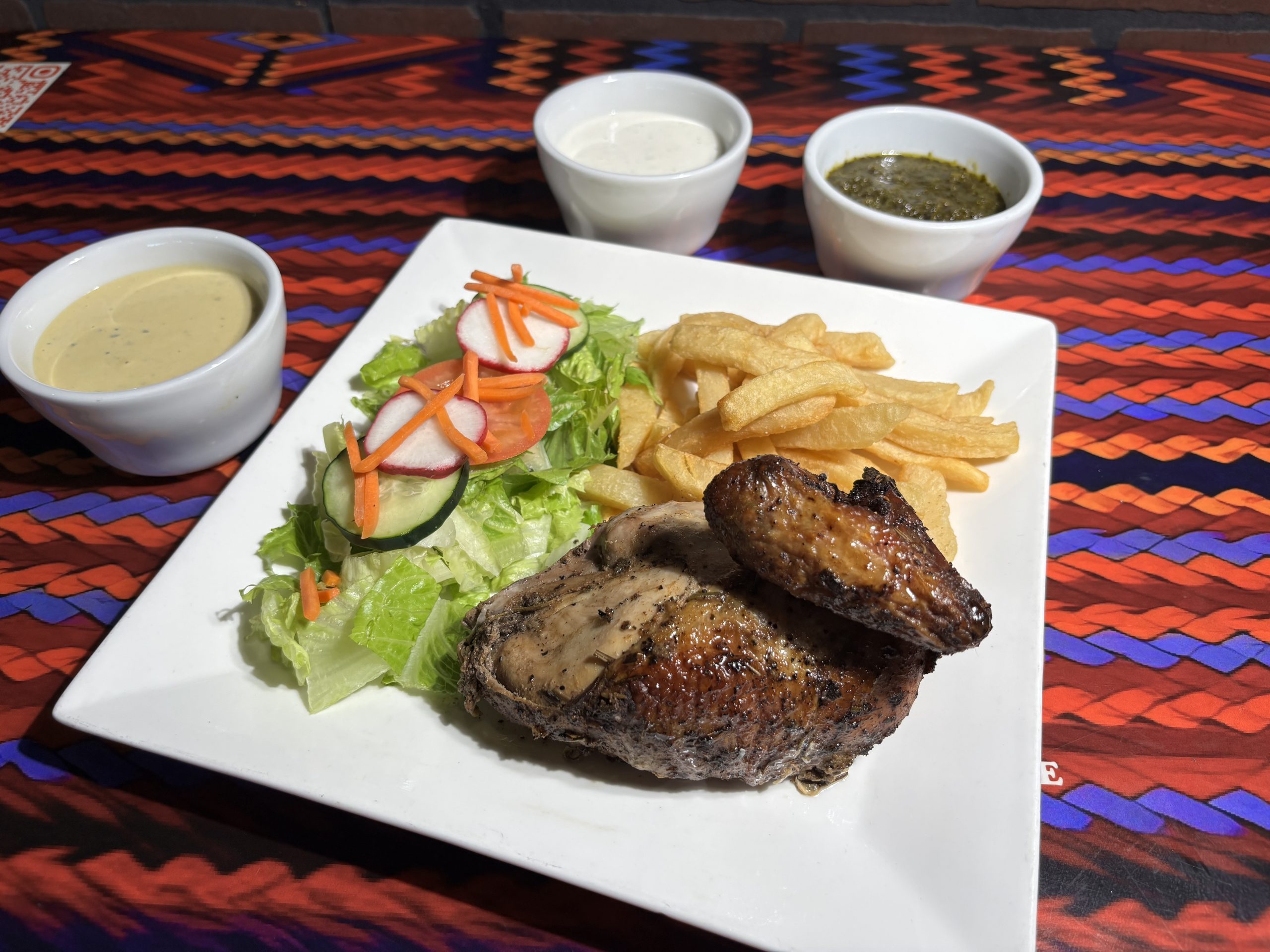 Quarter chicken comes with two sides of your choice and aji sauce.